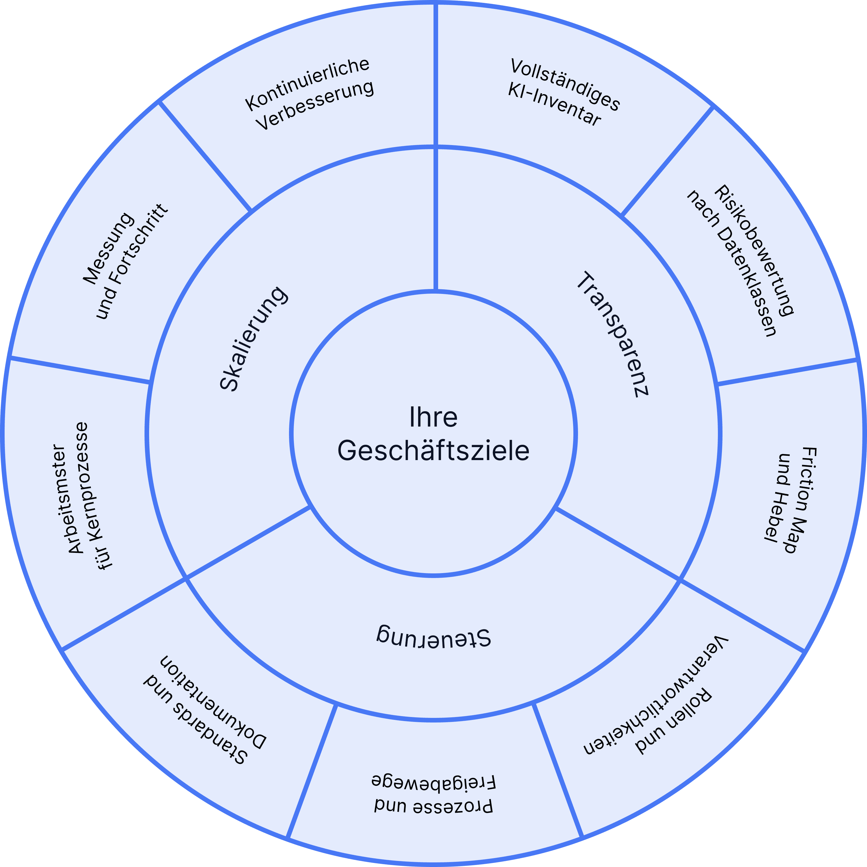 Erfolgreiche AI Governance erfordert mehr als Richtlinien oder einzelne Tools. Unser Framework strukturiert die Komplexität systematisch über drei ineinandergreifende Dimensionen, die gemeinsam Ihre Geschäftsziele erreichen.